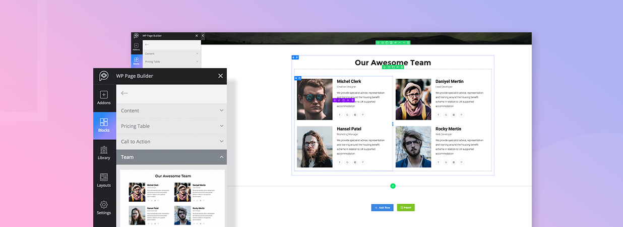 Team: Enlist team members with details. Showcase member’s profile in 3 layouts. Display designation and description with the member profiles.